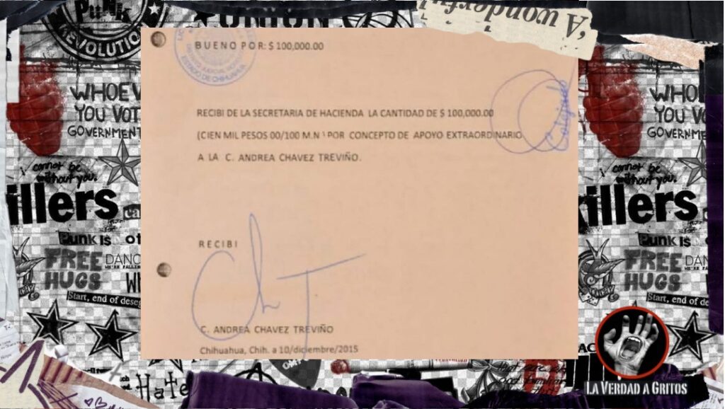 De acuerdo con archivos resguardados por la Secretaría de Hacienda de Chihuahua, el 10 de diciembre de 2015 Andrea Chávez recibió 100,000 pesos, con firma de recibido.