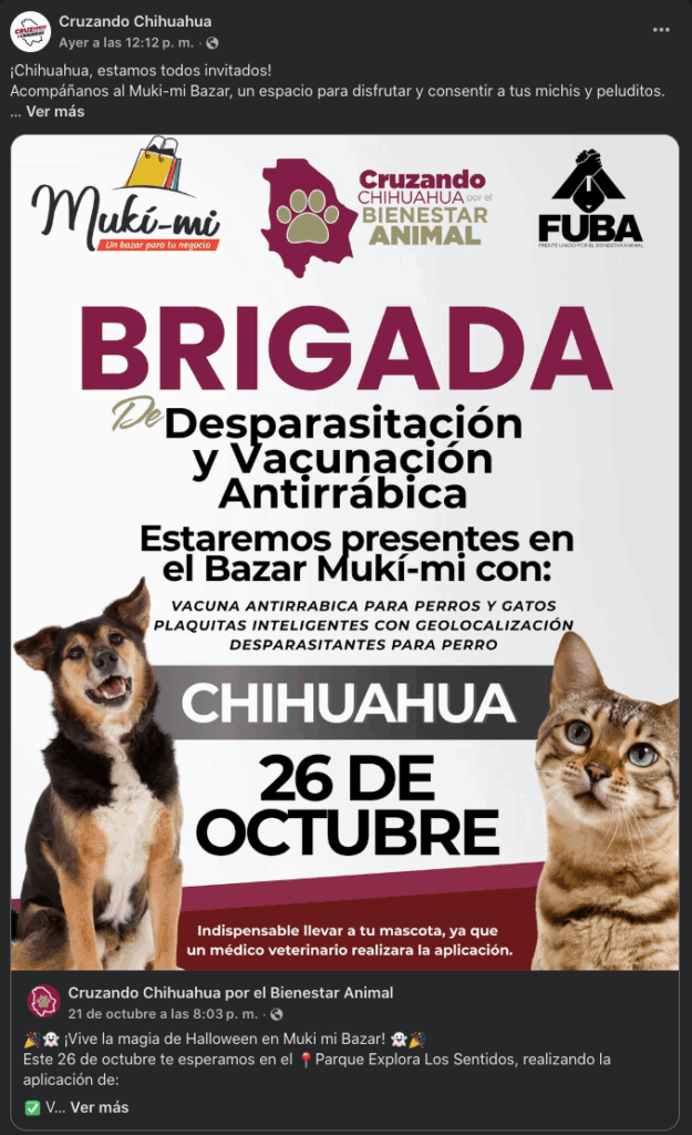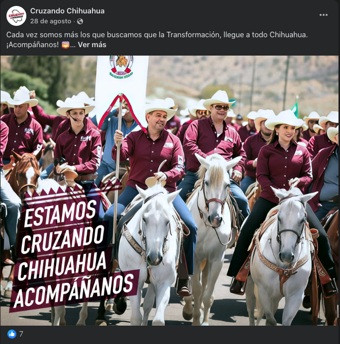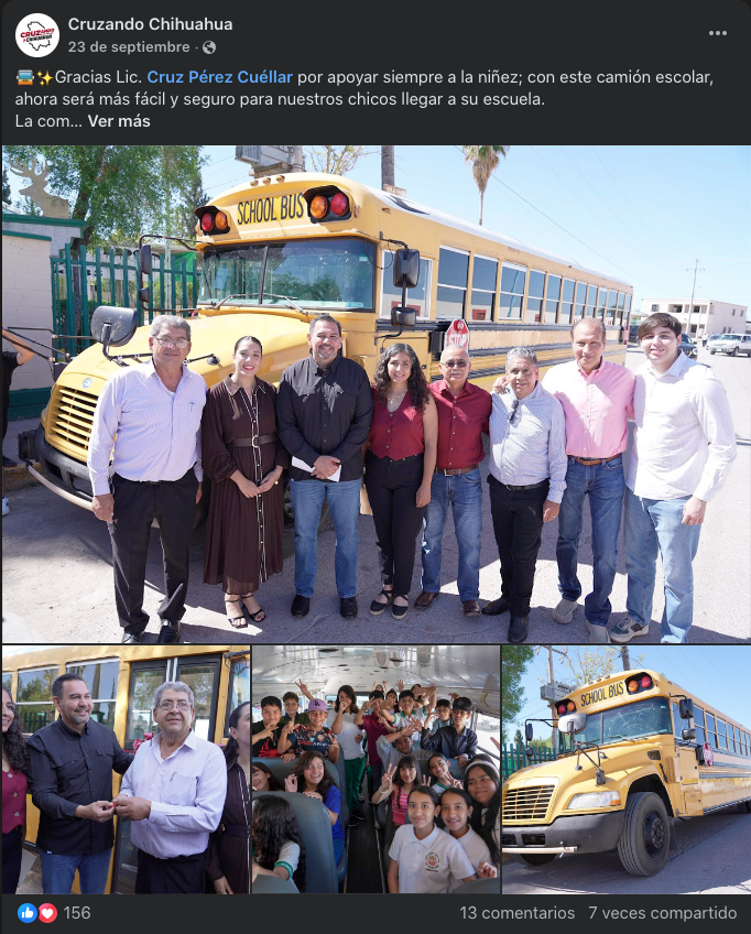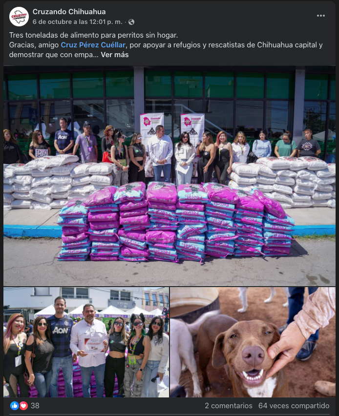Aunque la página oficial en Facebook de “Cruzando Chihuahua” apenas supera los 900 seguidores, el movimiento se expande como si tuviera un alto presupuesto de campaña: bardas pintadas en la sierra, camionetas rotuladas, brigadas con uniformes nuevos, entrega de vehículos, mobiliario escolar, materiales de construcción y hasta alimento esterilizaciones para mascotas.