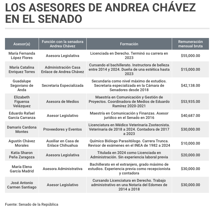 De acuerdo con una revisión basada en declaraciones patrimoniales y registros públicos, Andrea Chávez contó al menos con 10 personas contratadas por el Senado como apoyo a su trabajo, con funciones que van desde asesoría legislativa hasta logística, “proveedores y eventos” y atención en casas de enlace.